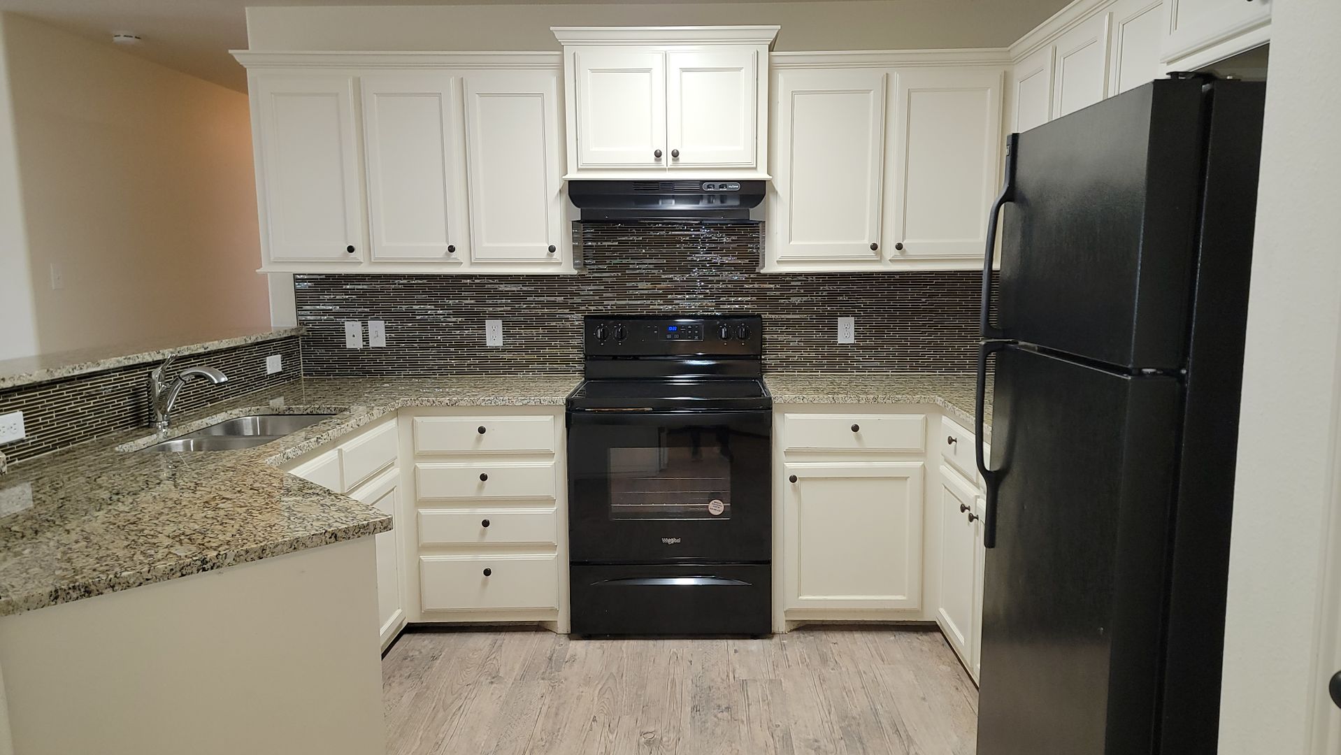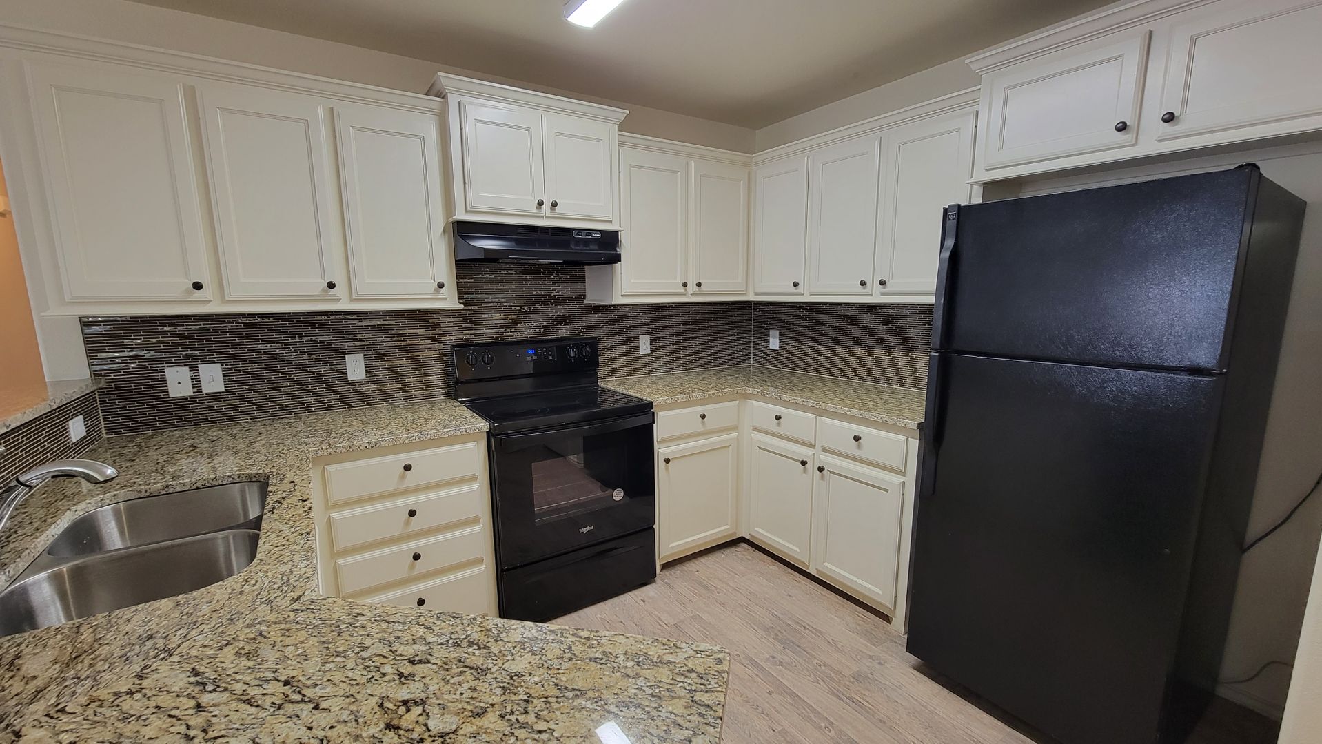Beautifully updated 3/2/2 home featuring granite countertops, modern backsplash, and black kitchen appliances. Plank flooring in common areas, carpet in bedrooms, and bronze fixtures and fans throughout. Enjoy an electric fireplace with remote, large walk-in closets in every bedroom, and two-inch faux blinds. French doors open to a covered patio with a sprinkler system for easy lawn care. Includes a rear-entry two-car garage with opener, paved alley access, attic storage, and yard maintenance—no mower needed!